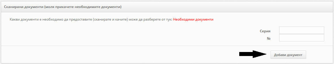 В раздел „Сканирани документи" попълнете коректно Серия и № на дипломата Ви за висше образование и прикачeте всички необходими за Вашето кандидатстване документи (вижте документите тук), натискайки бутона „Добави документ". Ако Вашата диплома все още не е издадена към момента на подаването на документите за кандидатстване е необходимо да попълните следните данни: в полето „Серия" попълнете изходящия номер, а в полето „Номер" попълнете датата нана уверението/академичната справка.