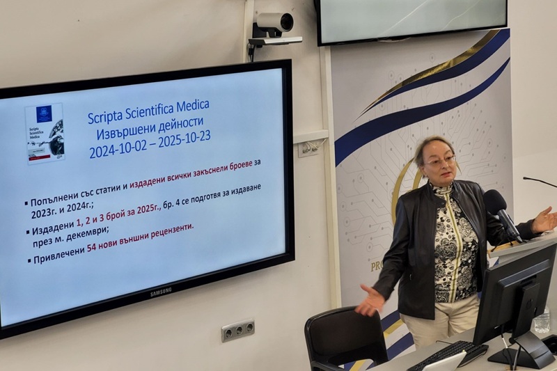 На срещата беше представен и напредъкът на университетското издание Scripta Scientifica Medica. Проф. Бистра Галунска обобщи редакционната дейност за периода април-октомври 2025 г. Бяха изнесени данни за подадените и приетите статии, за общия брой на публикациите, за привлечените външни рецензенти. Във връзка с изпълнението на критерите за кандидатстване на списанието в индексирани световни бази данни, от март 2025 г. е въведената нова съвременна платформа за подаване и рецензиране на статии, нова онлайн визия на университетското издание, актуализирани са всички текстове, касаещи списанието, политиките и етичните принципи за публикуване.