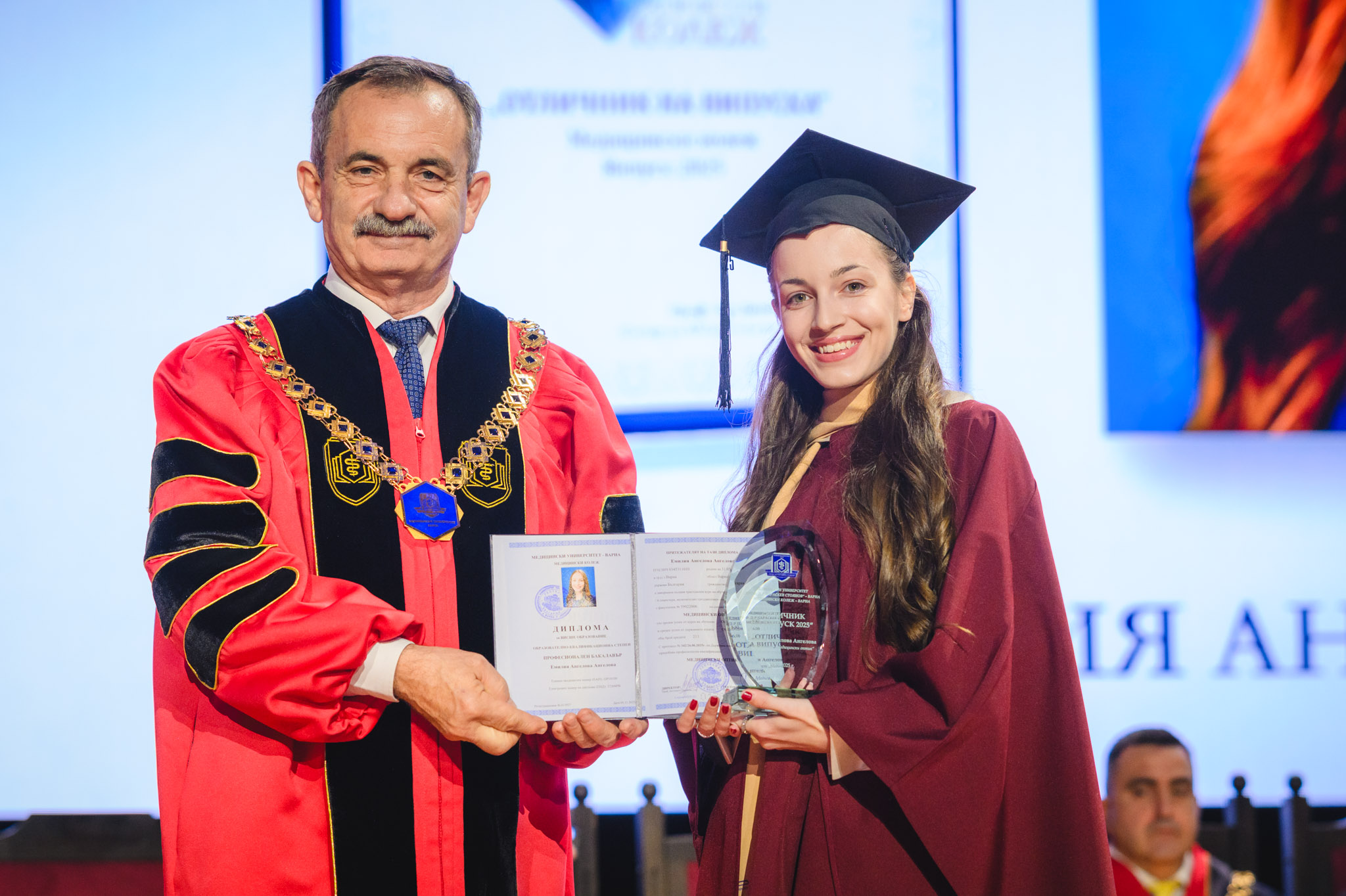 След полагането на тържествената клетва проф. д-р Димитър Райков връчи дипломите. Първенец на випуска е Емилия Ангелова от специалност „Медицински оптик“. Тя получи плакет, грамота и паричнa награда от ректора, както и парична награда от името на кмета на Варна. В словото си тя благодари на академичното ръководство, на преподавателите и на близки си за подкрепата по време на обучението.
